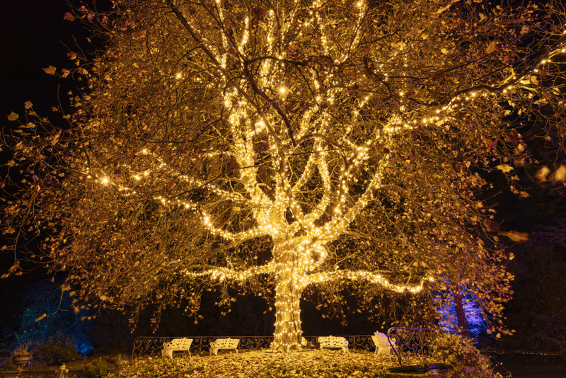 Auch kulinarisch wird es festlich: Im Palmenhaus warten süße Versuchungen, winterliche Cocktails und heiße Getränke auf die Gäste. Von hier führt der Weg in den Rosengarten, wo rot-weiße Lichtrosen blühen und ein funkelnder Lichtbrunnen sprudelt. Selbst die ehrwürdige Viktoria-Linde, 163 Jahre alt, erstrahlt in majestätischem Glanz.